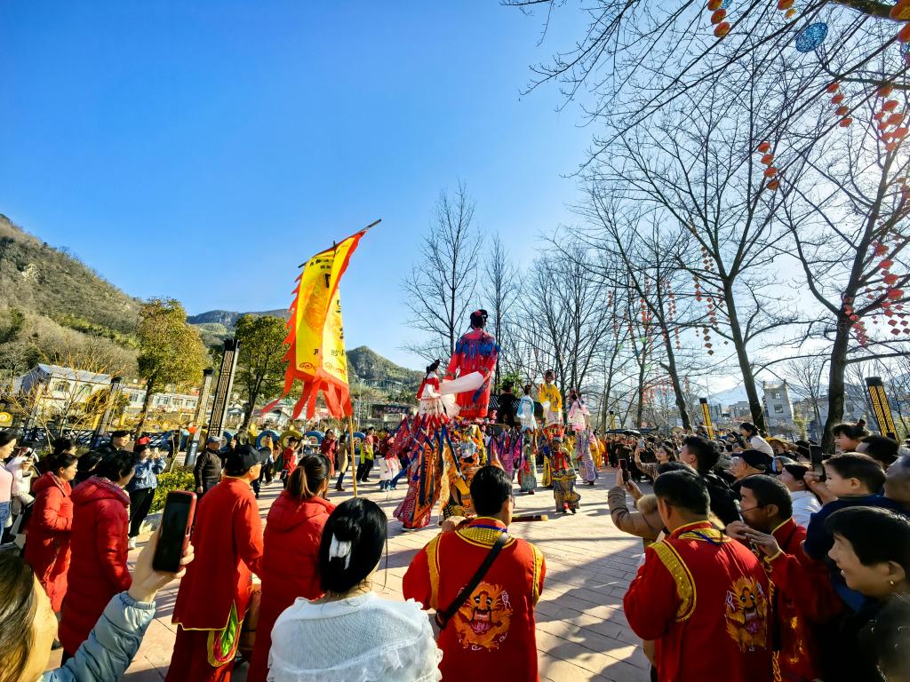 2月12日,游客在六万情峡景区观看“肘阁抬阁”非遗表演。新华社记者 汪海月 摄