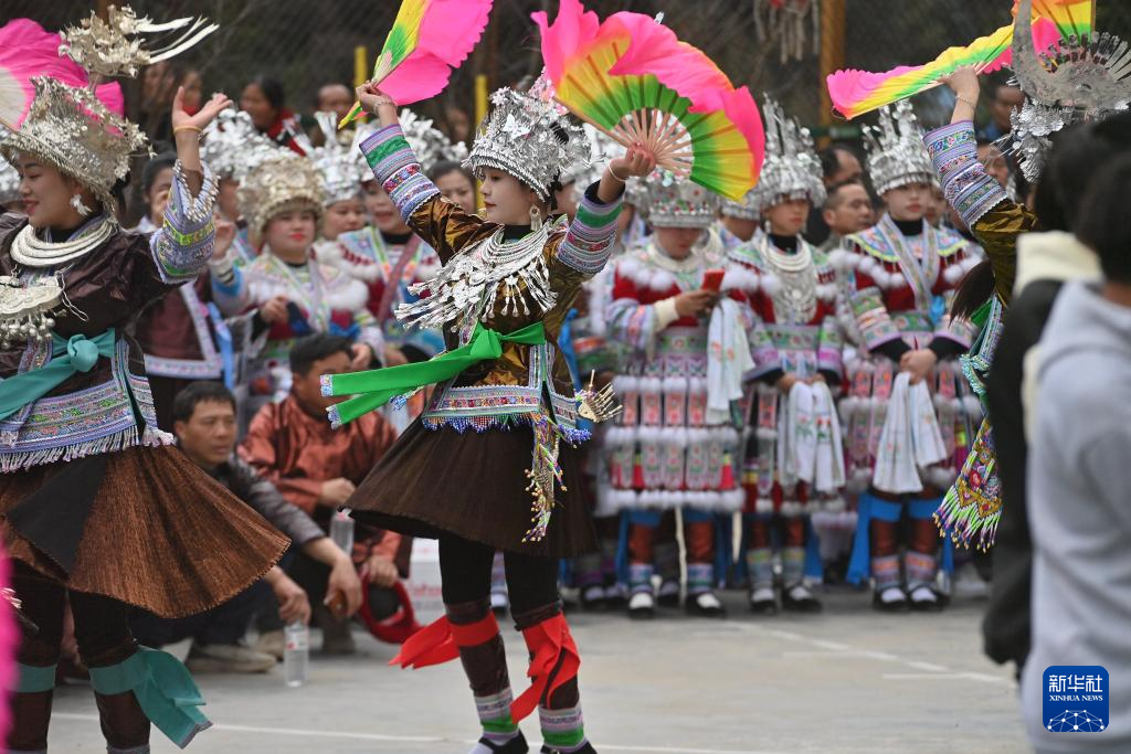2月14日,在广西柳州市融水苗族自治县杆洞乡党鸠村,苗族姑娘在“打同年”活动中跳苗舞。新华社记者 黄孝邦 摄