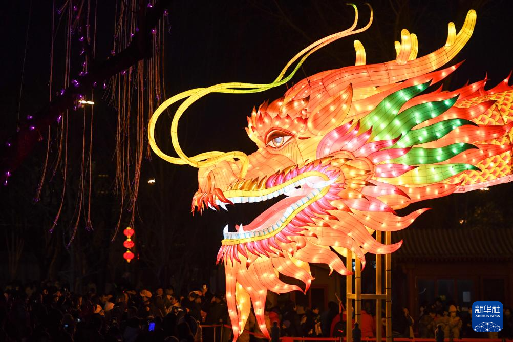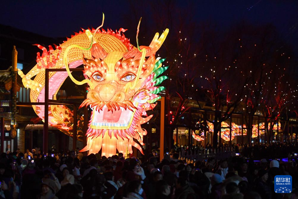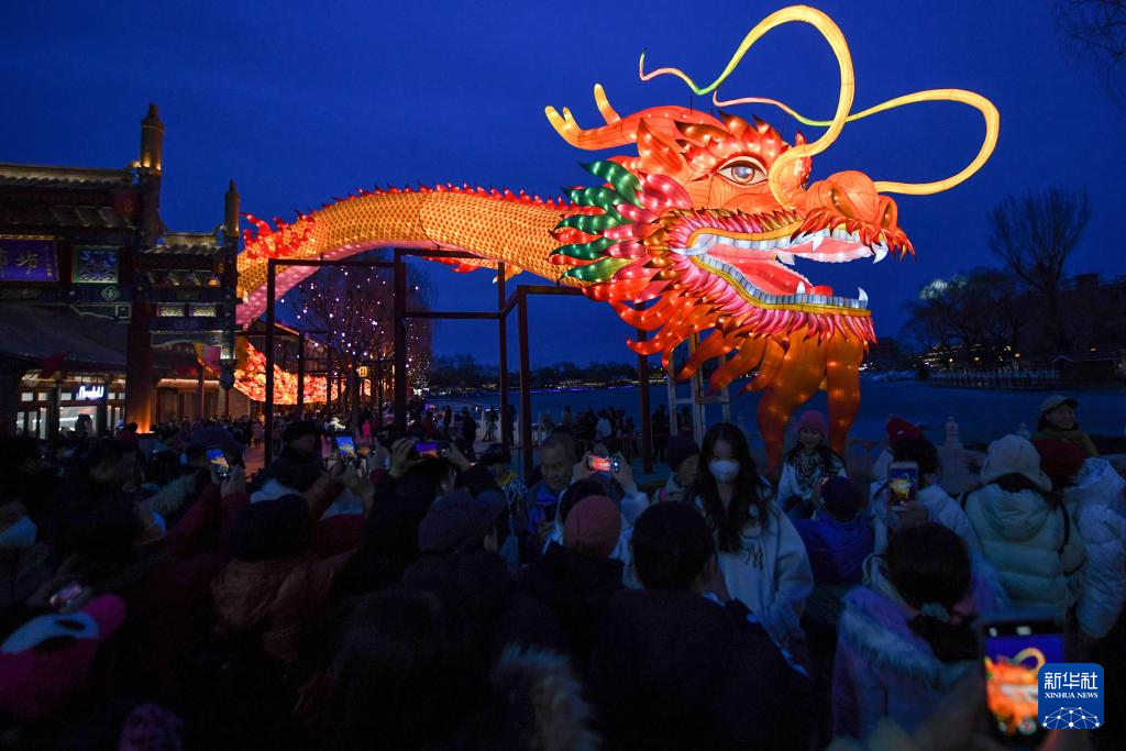 2月14日,在北京市西城区什刹海荷花市场,游客观赏巨型龙灯“蛟龙出海”。新华社记者 鞠焕宗 摄