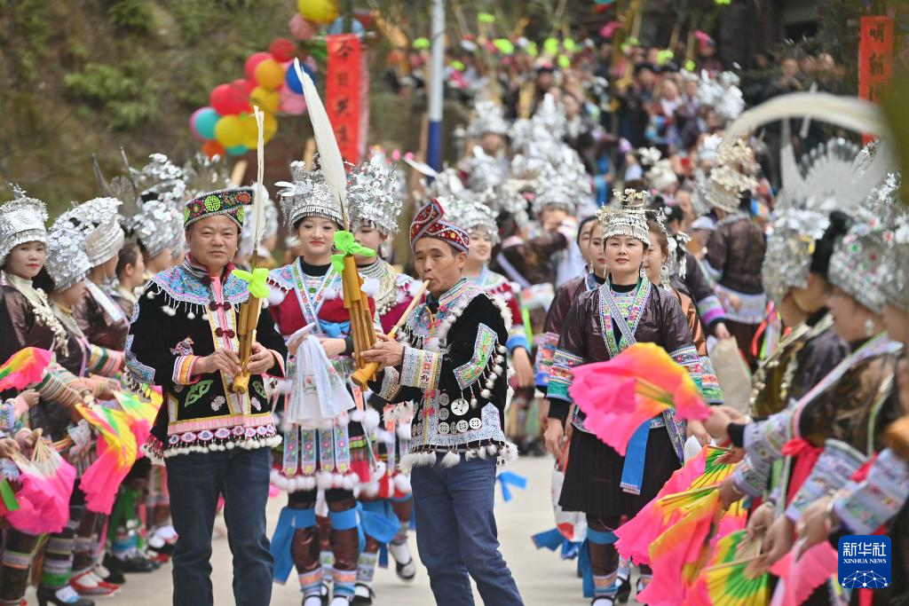 2月14日,在广西柳州市融水苗族自治县杆洞乡党鸠村,苗族群众在“打同年”活动中在吹芦笙。新华社记者 黄孝邦 摄