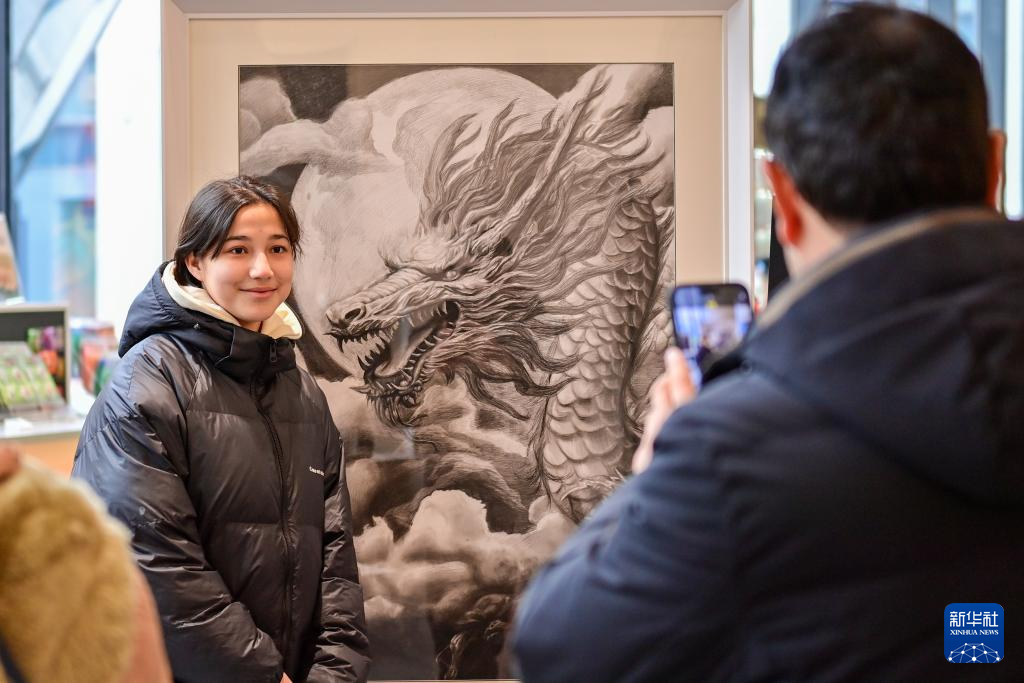 2月14日,参观者在新疆维吾尔自治区博物馆文创区打卡拍照。新华社记者 丁磊 摄