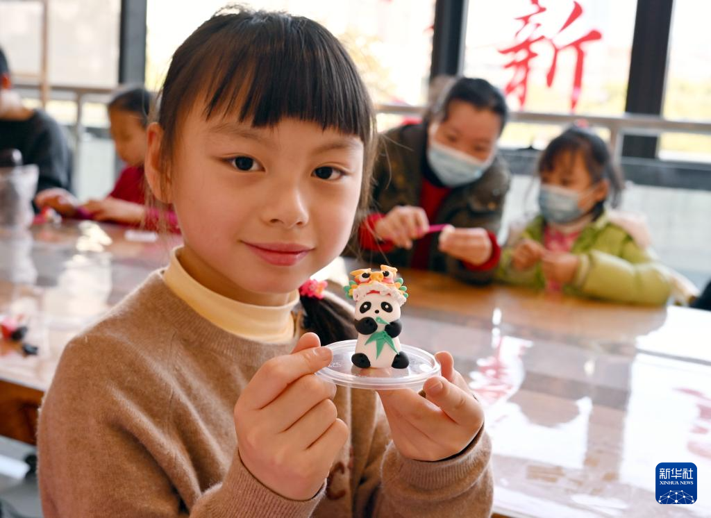 2月14日,在上海市群众艺术馆“非遗会客厅”,小朋友展示和妈妈一起制作的海派面塑作品。新华社记者 刘颖 摄