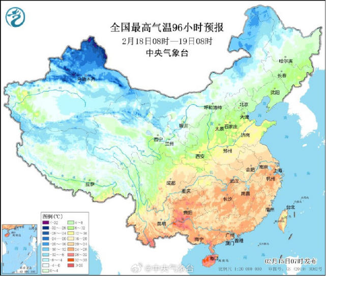 在寒潮主体影响之前,16日至18日,中东部大部地区气温显著回升。19日前后,江南大部、华南及贵州、云南等地日最高气温有25~28℃,江西、福建等地部分地区可达30℃左右,接近或突破历史旬极值。