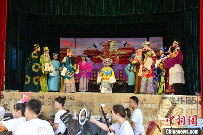 资料图为2023年9月22日,陈禹瑄(右三)和剧团演员们正在漳州市漳浦县深土镇车敖村唱戏。 中新社记者 张斌 摄
