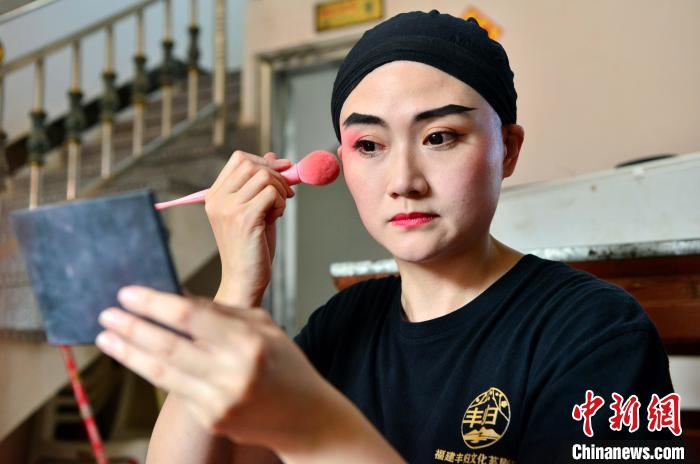 资料图为2023年9月22日,陈禹瑄正在化妆,准备上台演出。 中新社记者 张斌 摄