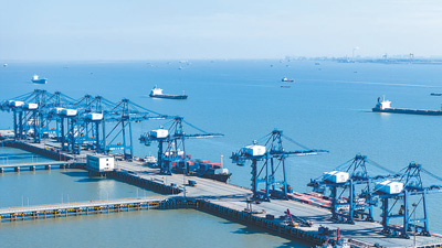 正月初七,江苏南通港通海港区集装箱装卸繁忙有序。
