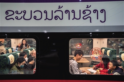 2月14日,游客在云南昆明南站乘坐中老铁路国际旅客列车准备前往老挝旅游。