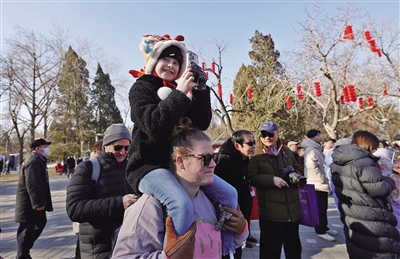 2月10日,北京龙潭庙会,外国小朋友坐在家长的肩膀上,开心地拍摄庙会盛况。