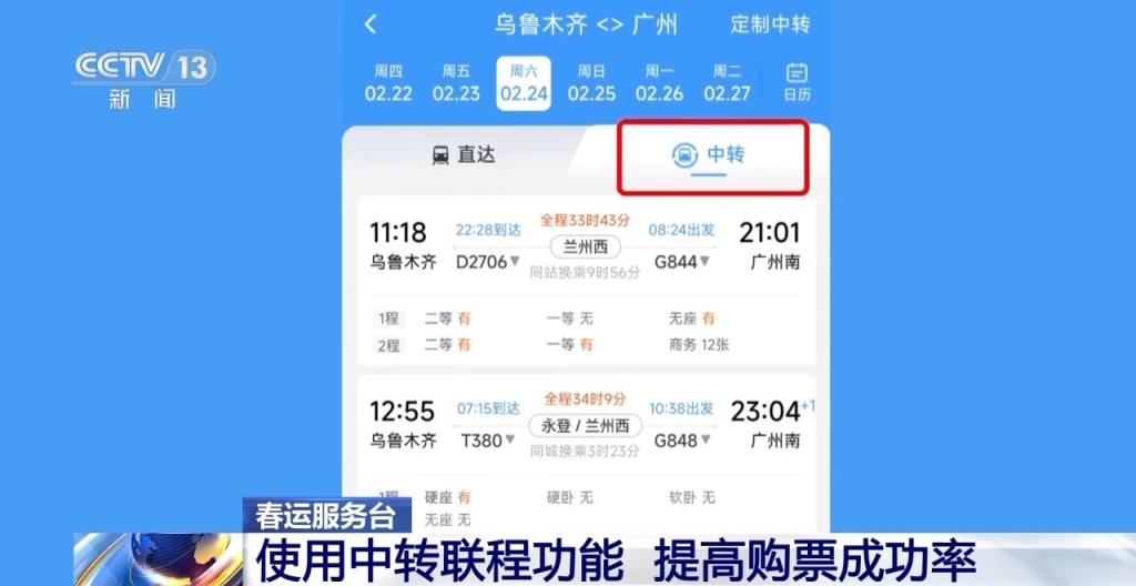 如果通过铁路换乘无法购买到车票,旅客还可以试一试通过分段乘坐民航和铁路的“空铁联运”的方式前往目的地。今年春运,不少火车站推出空铁接驳快线服务。比如,厦门北站启动了“空铁联运”综合服务中心,旅客乘坐高铁到达厦门北站,在车站内就能办理民航值机手续,再通过机场快线、BRT专线快速抵达机场。此外,旅客还可以通过水路与铁路的“铁水联运”以及公路、水路、铁路中转联程换乘的方式前往目的地。