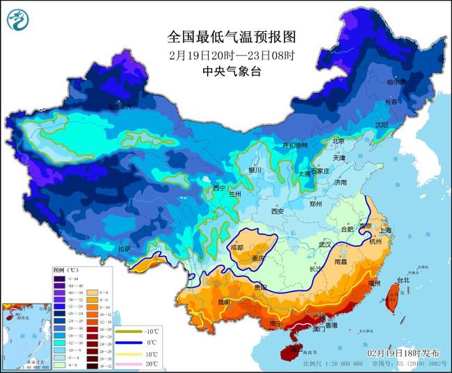 寒潮橙色预警:受寒潮影响,预计,2月19日20时至2月22日20时,我国中东部大部将自北向南先后出现降温,日平均或最低气温普遍下降8~12℃,华北南部、黄淮西部、江淮、江汉、江南、华南中北部及贵州等地气温将下降12~18℃,其中,湖南南部、贵州东部等地的部分地区累计降温幅度可达20℃以上。2月23日前后,最低温度0℃线将南压到苏皖南部至湖南南部、贵州南部一带。
