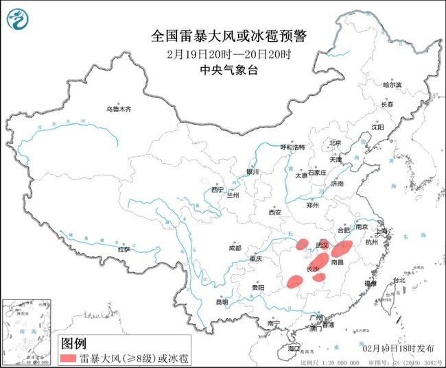 强对流天气蓝色预警:预计2月19日20时至20日20时,安徽南部、湖北东部和南部、湖南中南部、江西中北部、广西东北部等地的局地将有8-10级雷暴大风或冰雹天气;安徽中南部、江苏南部、湖北东部、湖南东北部、江西北部等地的部分地区将有短时强降水天气,最大小时雨量20-30毫米,局地可达35毫米以上。