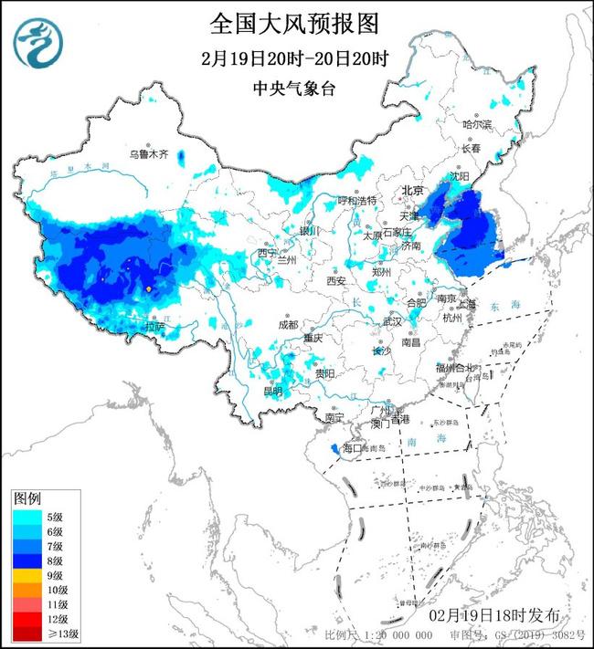 大风蓝色预警:预计,2月19日20时至20日20时,西藏中西部、青海中南部、内蒙古中西部、辽宁南部、华北东部、黄淮西部和东部、江淮西部等地的部分地区有5~7级风,阵风8~9级。渤海、渤海海峡、黄海大部海域将有7~8级,阵风9~10级的大风。