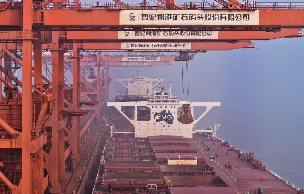 2024年2月7日,一艘轮船靠泊在唐山港曹妃甸港区矿石码头卸载(无人机照片)。新华社记者 杨世尧 摄