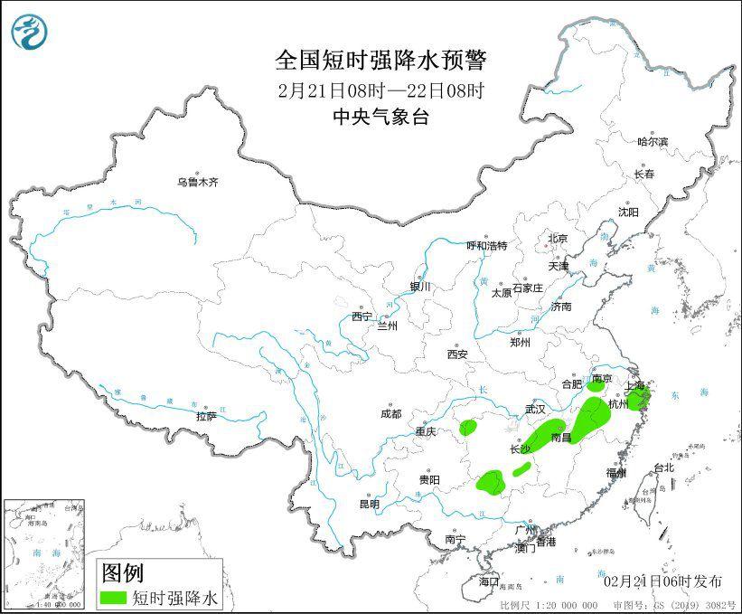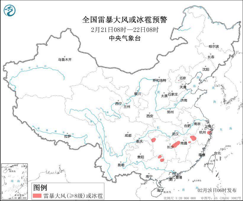 中央气象台2月21日6时继续发布强对流天气蓝色预警:预计2月21日8时至22日8时,湖南西北部和东部、江西中北部、浙江西部和东部、广西东北部等地的局地将有8-10级雷暴大风或冰雹天气;安徽南部、湖南西北部和中南部、江西中北部、浙江中北部、广西东北部等地的部分地区将有短时强降水天气,最大小时雨量20-30毫米,局地可达40毫米以上。预计,强对流的主要影响时段为今天白天。