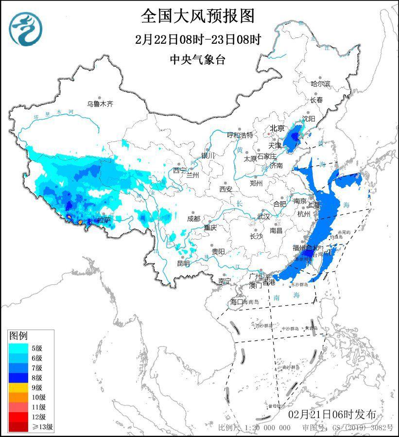 2月22日8时至23日8时,西藏大部、青海南部等地部分地区有5~6级大风,阵风7~9级;渤海、渤海海峡、黄海西部海域、东海西部海域、南海东北部海域、台湾海峡将有7~8级、阵风9级的东北风。