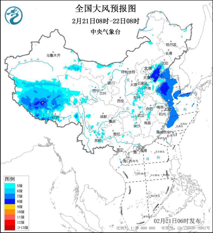 中央气象台2月21日6时继续发布大风蓝色预警:预计,2月21日8时至22日8时,西藏大部、青海西部、甘肃北部等地部分地区有5~6级大风,阵风7~9级;渤海、渤海海峡、黄海中部和南部海域、东海西部海域将有7~8级、阵风9级的偏北到东北风。