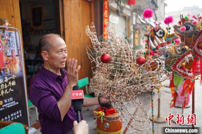 2月20日,在广西南宁市宾阳县,扎龙老匠人邹玉特向中新社记者介绍炮龙制作工序。陈冠言 摄