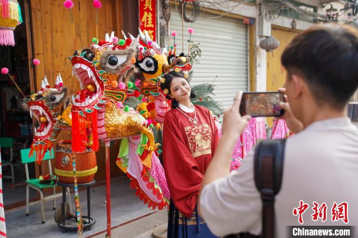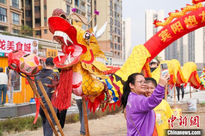 2月20日,在广西南宁市宾阳县,游客与炮龙合影。陈冠言 摄