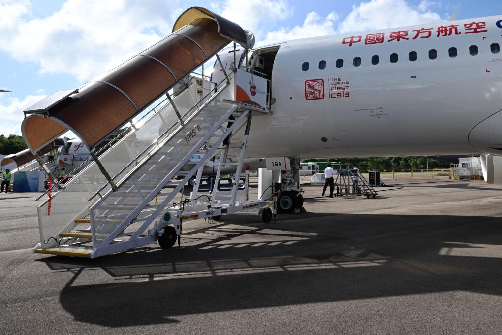目前,新加坡航展正在樟宜会展中心举行。由中国东方航空公司接收的全球首架投入商业运营的C919国产大型客机,正在航展的室外静态展区向来自世界各地的企业和公众展示。