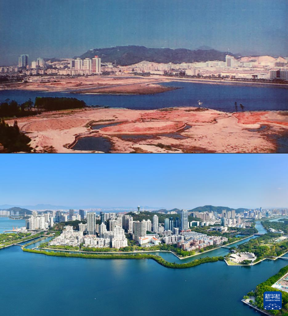 拼版照片:上图为20世纪80年代拍摄的筼筜湖(资料照片);下图为2024年1月24日拍摄的厦门筼筜湖及周边城市景观(新华社记者姜克红摄,无人机照片)。