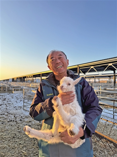 正月初一,村主任乔长厚在新村的新羊圈抱着小羊羔。摄影/新京报记者 乔迟