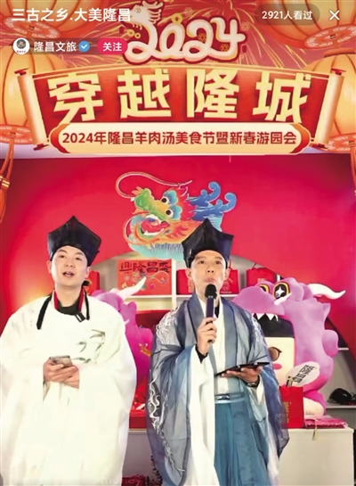2月5日晚,徐李正(左)身着古装,在当地文旅局账号参与推介家乡的新春活动。直播画面截图