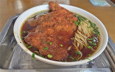 在厨房外间,咣当咣当的,有师傅将猪排往面粉里拍打,正面、反面都要滚过,拿手掌压实了,码在盒里待炸。再向外就是排队的顾客了,分为两个纵队,一队在收银处,付钱、拿了面票,便集成另一队,等在厨房的窗口前取面。