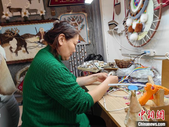 2月21日,在内蒙古呼伦贝尔市鄂温克族自治旗一家手工艺品工作室内,乌仁在制作太阳花手工艺品。 于嘉 摄