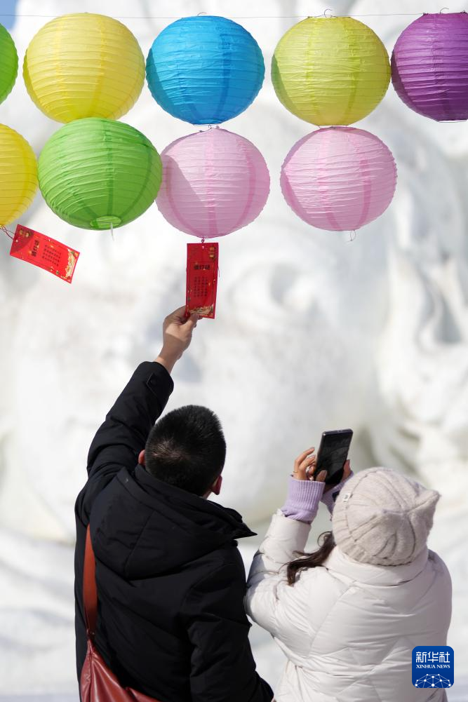 2月24日,游客在哈尔滨太阳岛雪博会园区内猜灯谜。新华社记者 王建威 摄