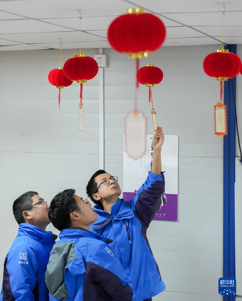 2月24日,建设者们在中建三局一公司上海浦东横沔项目部猜灯谜。新华社记者 丁汀 摄