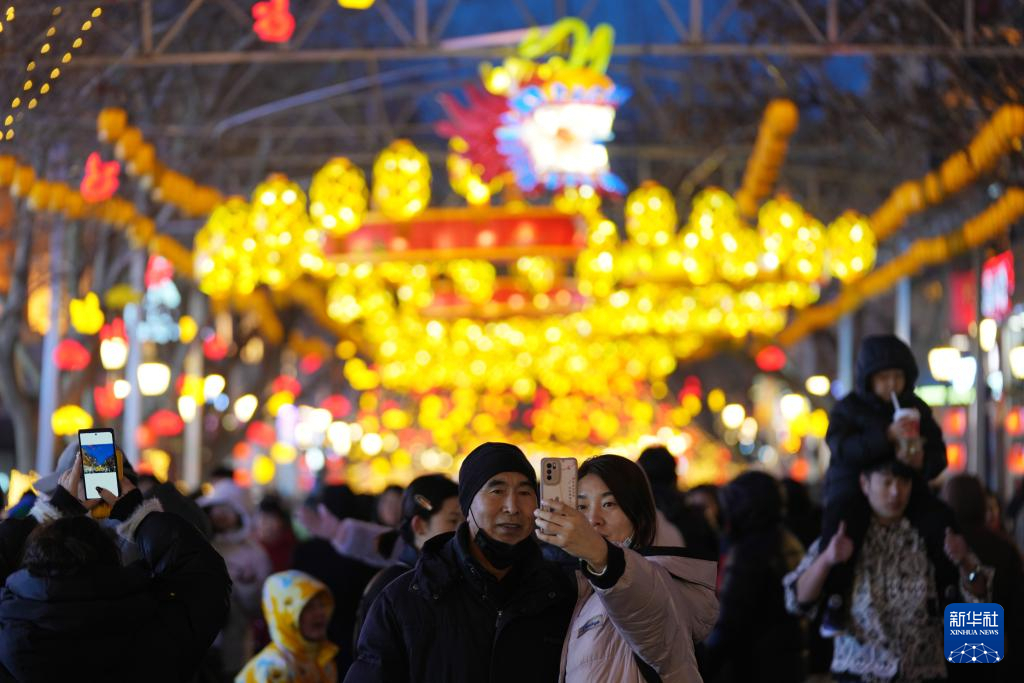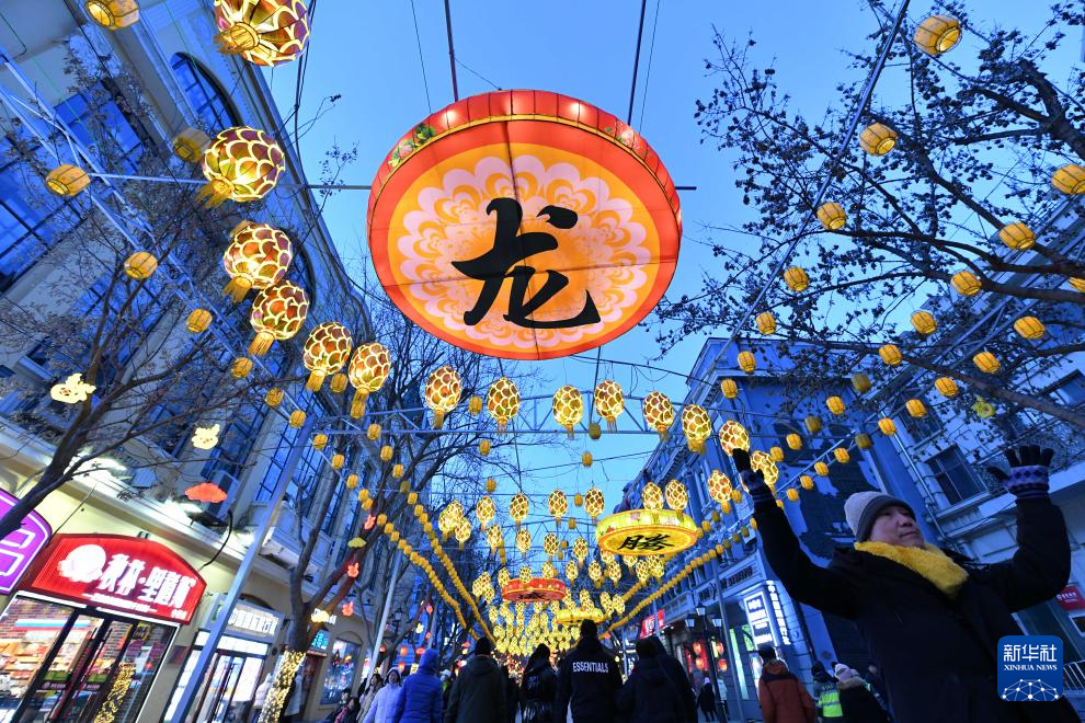 2月24日,在哈尔滨中央大街,游客在龙灯前留影。新华社记者 王建威 摄