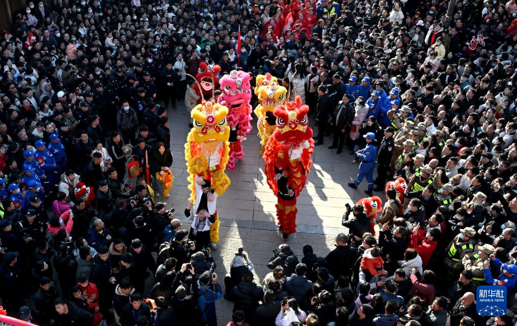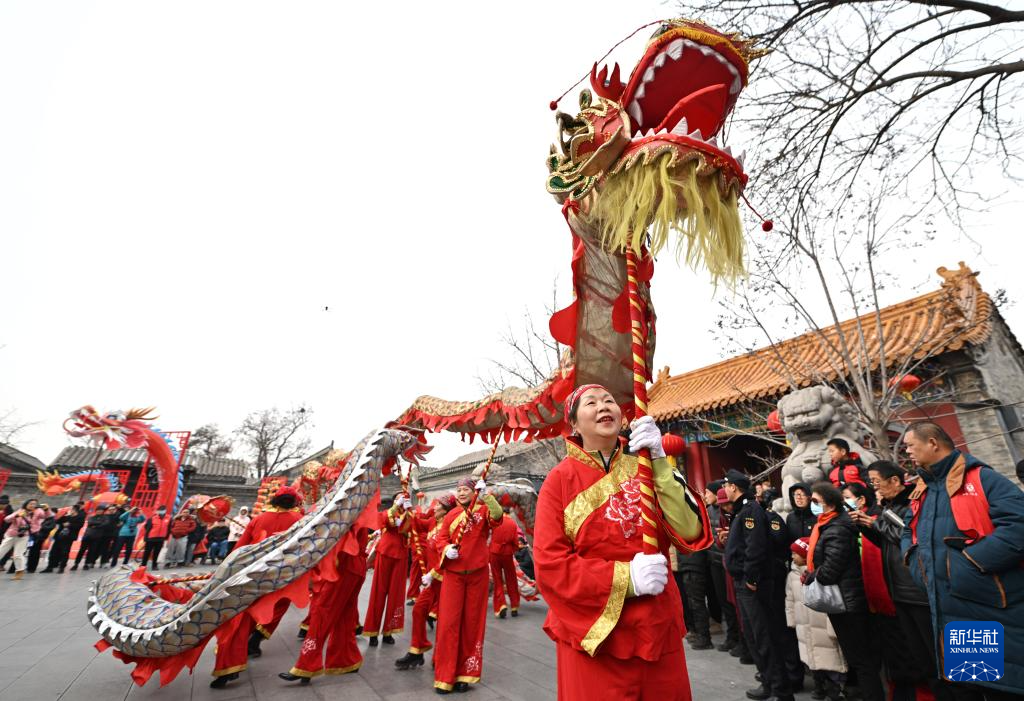 2月24日,游客在天津市西青区杨柳青古镇观看舞龙表演。新华社记者 李然 摄