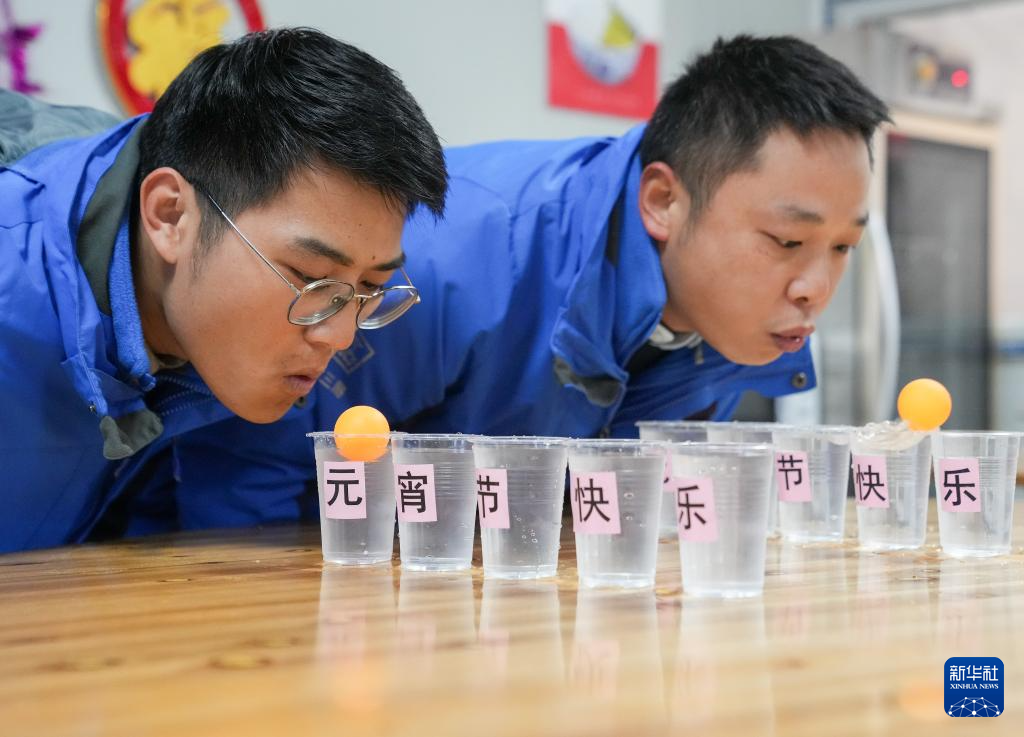 2月24日,建设者们在中建三局一公司上海浦东横沔项目部玩趣味游戏。新华社记者 丁汀 摄