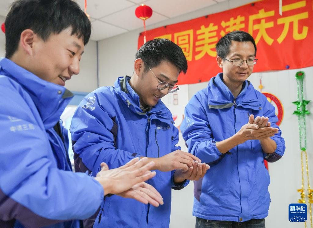2月24日,建设者们在中建三局一公司上海浦东横沔项目部包汤圆。新华社记者 丁汀 摄