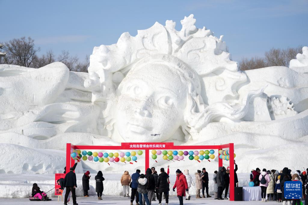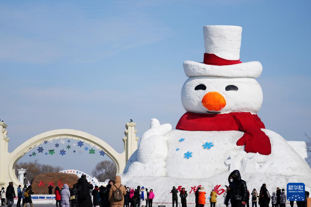 2月24日,在哈尔滨太阳岛雪博会园区门口,游客在大雪人前留影。新华社记者 王建威 摄