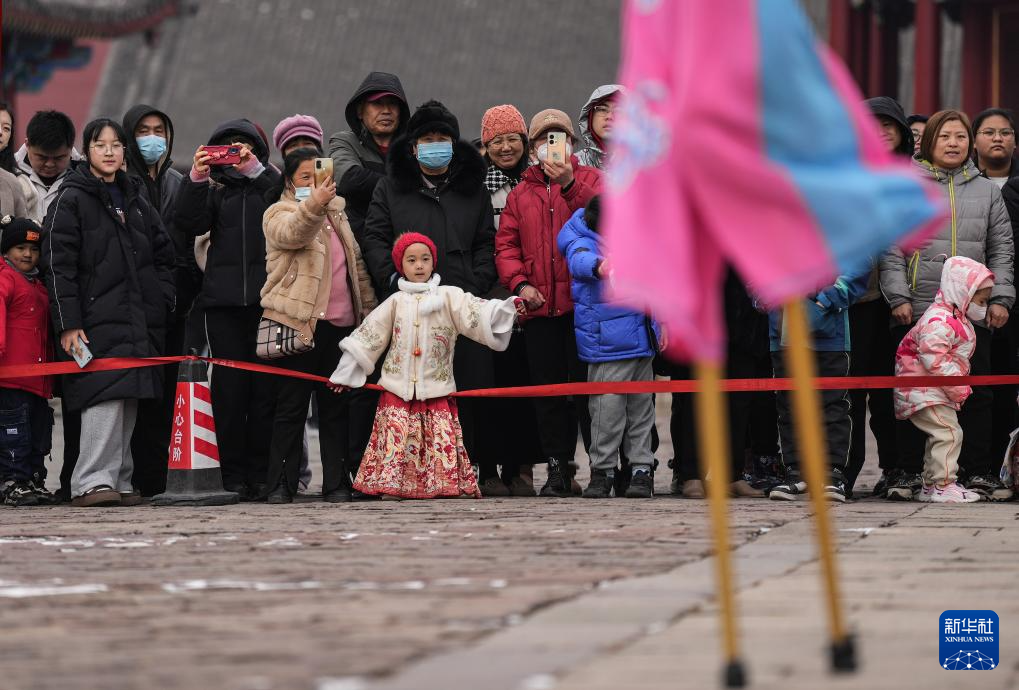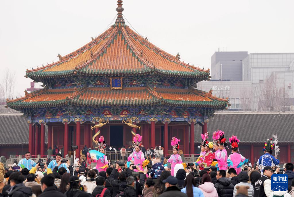 2月24日,游客在沈阳故宫博物院观看辽宁海城高跷展演。新华社记者 潘昱龙 摄