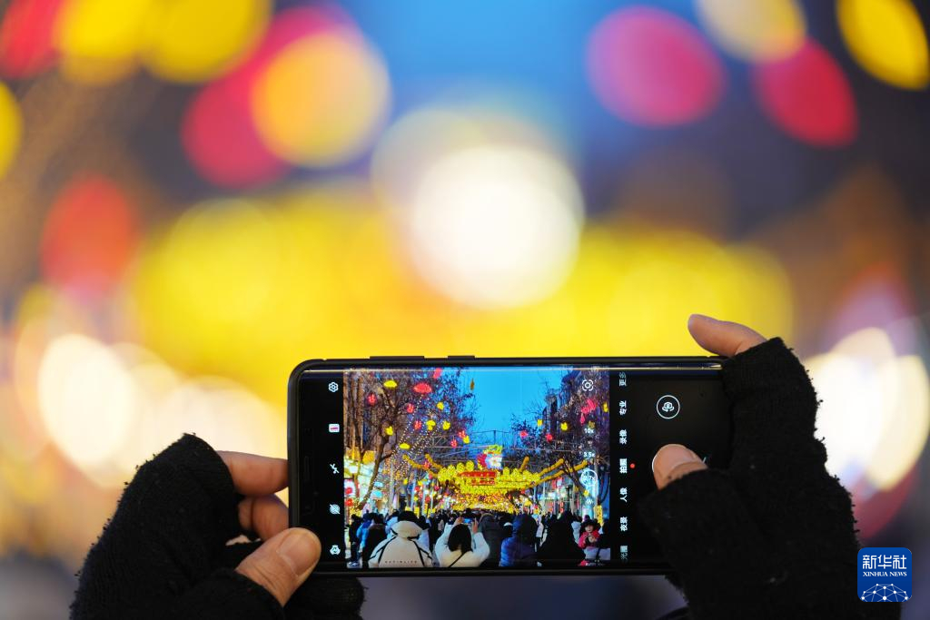 2月24日,在哈尔滨中央大街,游客在拍摄龙灯。新华社记者 王建威 摄
