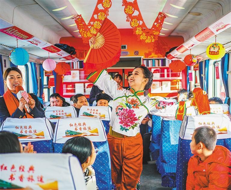 2月23日,在中国铁路太原局集团公司太原开往蔡家崖的4621次列车上,列车员精心准备了文艺节目,与旅客共度元宵佳节。张 炯摄(中经视觉)