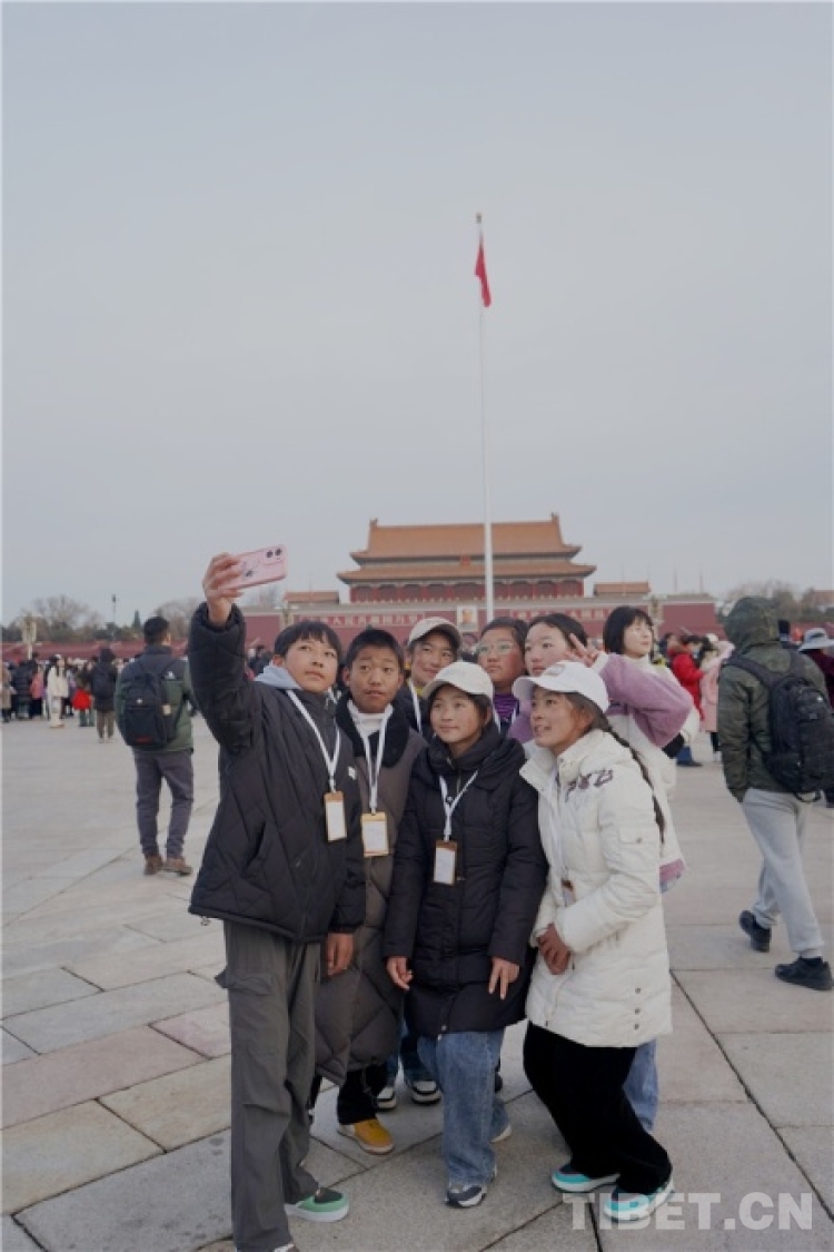 中国西藏网讯 “我们来自西藏,我在天安门广场看升旗,特别激动,特别开心,特别感动!”来自西藏自治区日喀则市边境县学生赴北京参观研学的22名学生激动地挤进老师的手机镜头高声喊着。