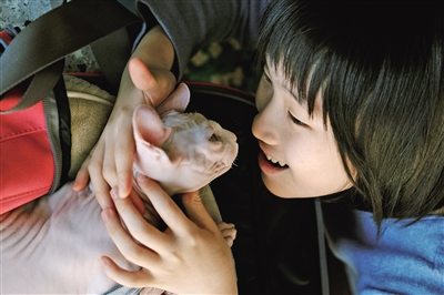 1月28日,天津,畅雨与无毛猫亲密接触。平日在家,这只猫就是畅雨的玩伴。