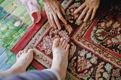 1月28日,天津,张雪准备为畅雨穿袜子。家中一直铺着厚地毯,防止畅雨跑动的声音影响楼下邻居。