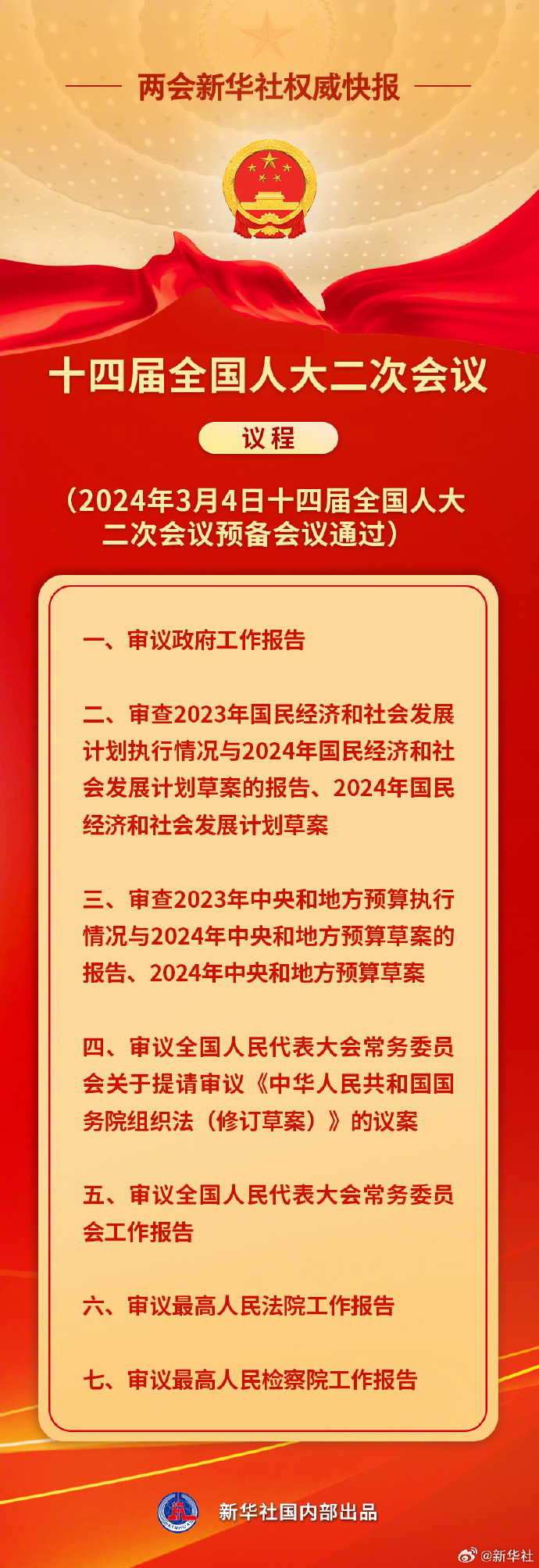 来源标题:两会新华社权威快报丨十四届全国人大二次会议议程抢鲜看