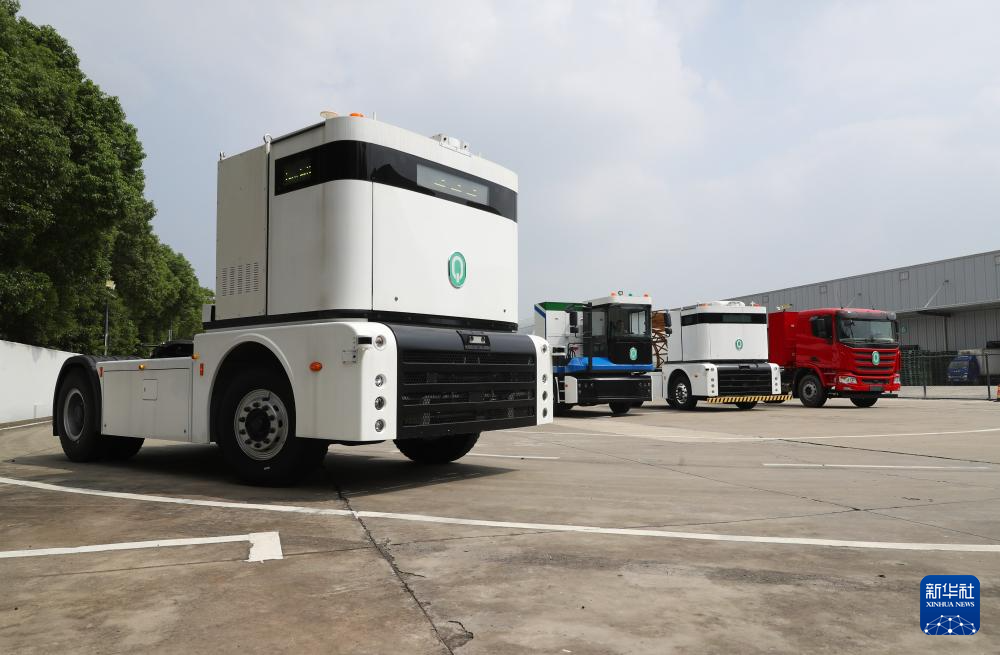 一辆西井科技的无人驾驶重卡Q-Truck(前)在位于上海的无人驾驶商用车联合实验室场地上进行动态测试(2023年9月26日摄)。新华社记者 方喆 摄