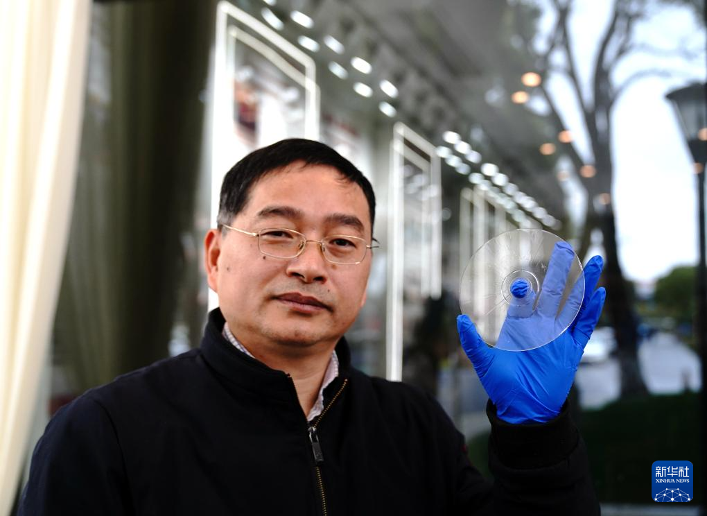 中国科学院上海光学精密机械研究所研究员阮昊展示“超级光盘”(2024年2月22日摄)。新华社记者 张建松 摄