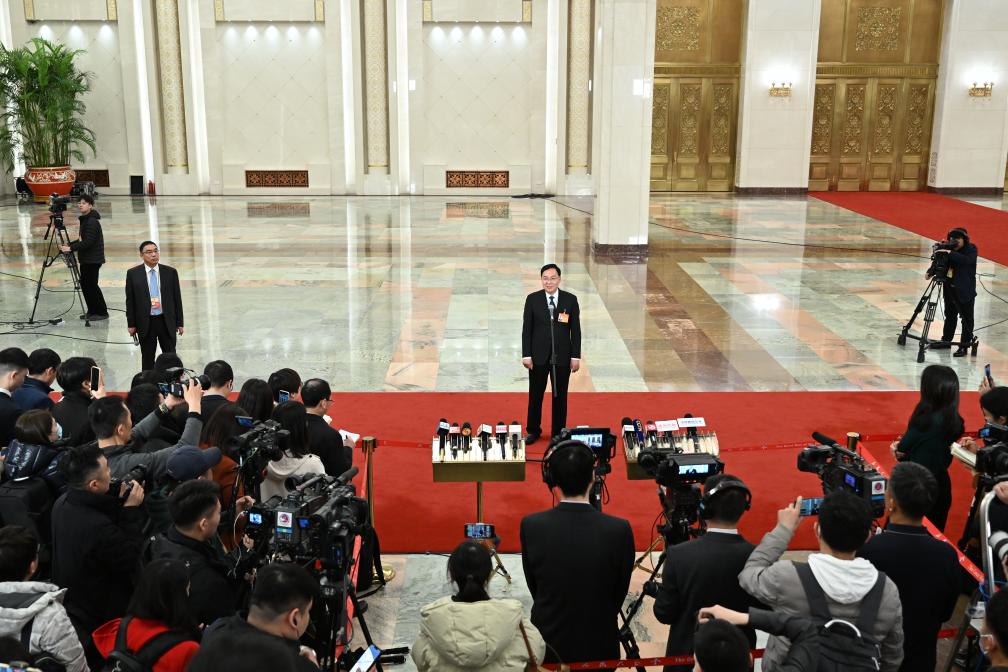 3月5日,第十四届全国人民代表大会第二次会议首场“部长通道”集中采访活动在北京人民大会堂举行。这是水利部部长李国英接受媒体采访。新华社记者 牟宇 摄