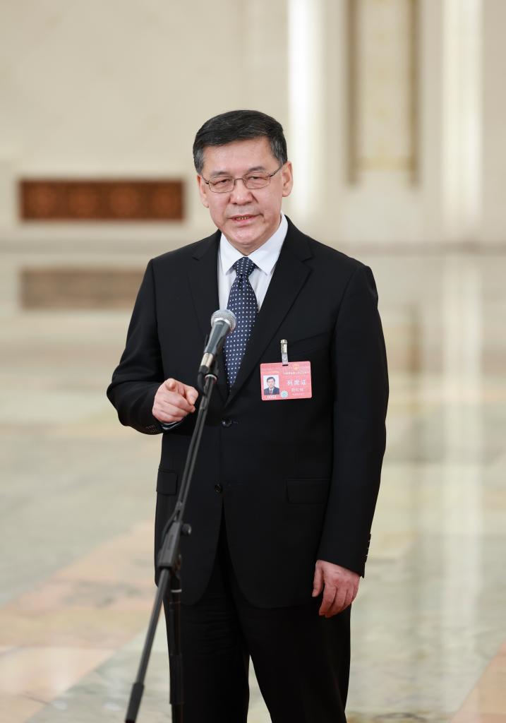 3月5日,第十四届全国人民代表大会第二次会议首场“部长通道”集中采访活动在北京人民大会堂举行。这是科学技术部部长阴和俊接受媒体采访。新华社记者 刘续 摄
