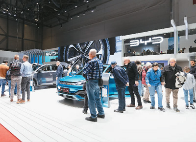 图为日内瓦国际车展上拍摄的比亚迪展台。