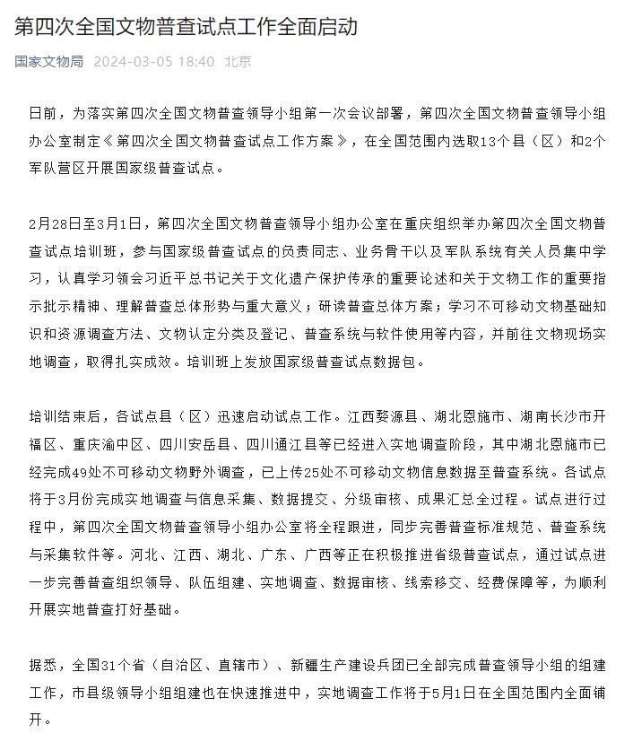 据国家文物局公众号消息,日前,为落实第四次全国文物普查领导小组第一次会议部署,第四次全国文物普查领导小组办公室制定《第四次全国文物普查试点工作方案》,在全国范围内选取13个县(区)和2个军队营区开展国家级普查试点。