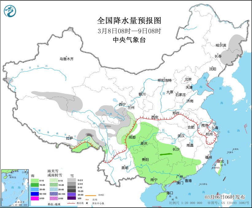 3月8日08时至9日08时,东北地区东部、西藏东部、青海东部、甘肃南部、川西高原北部等地部分地区有小雪或雨夹雪,其中,西藏东部等地部分地区有中到大雪。江南南部和西部、西南地区东部、华南等地部分地区有小雨,其中,湖南中西部等地部分地区有中雨(见图3)。