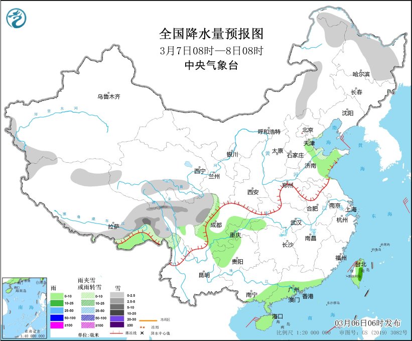 图1 全国降水量预报图(3月6日08时-7日08时)